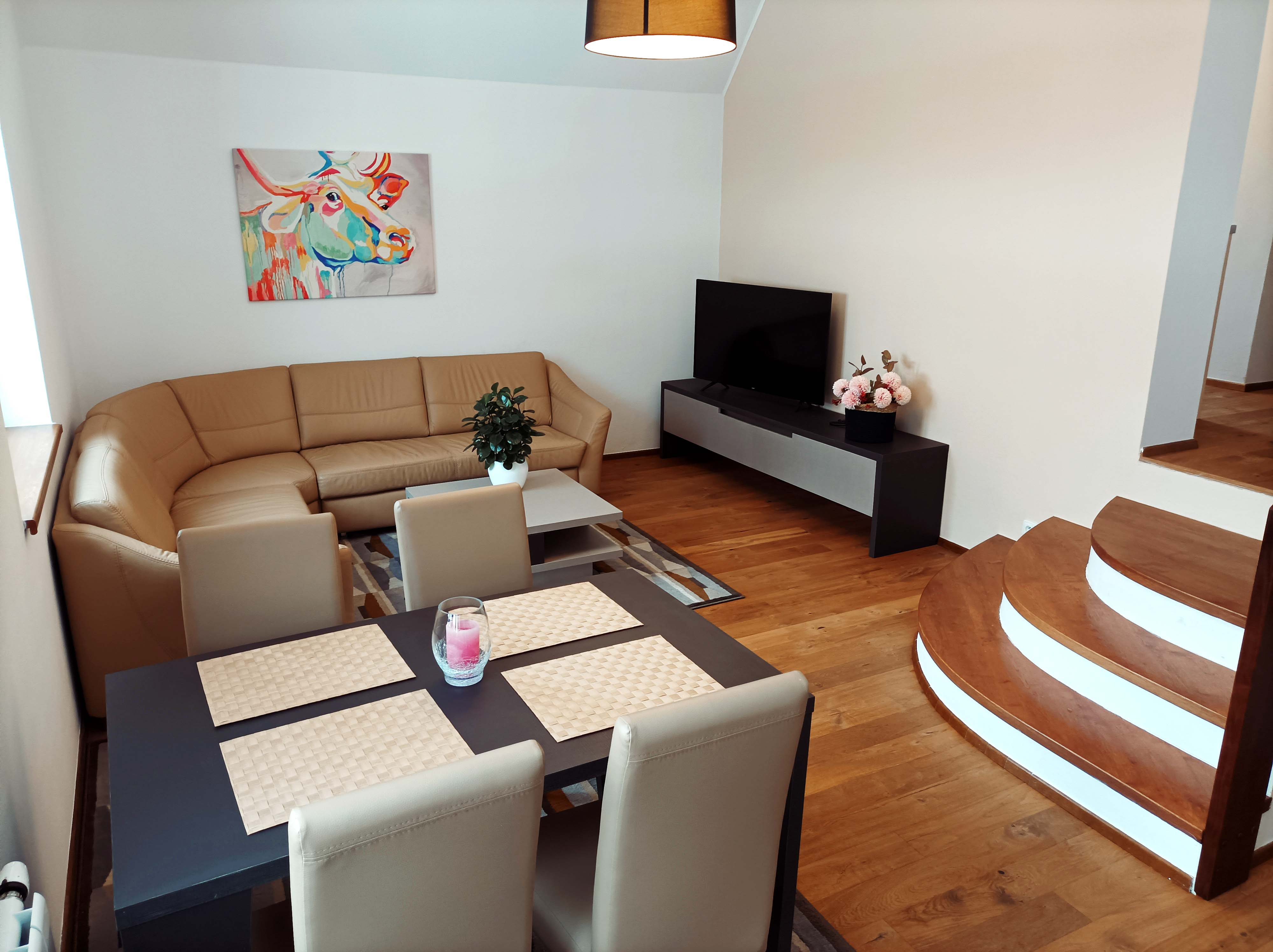 Obývací místnost: rozkládací pohovka, jídelní stůl, telefon, TV včetně programů rádií, WI-FI.