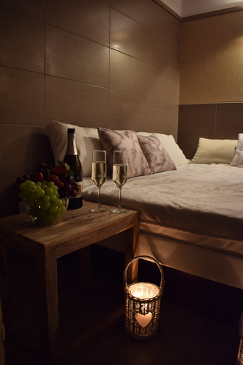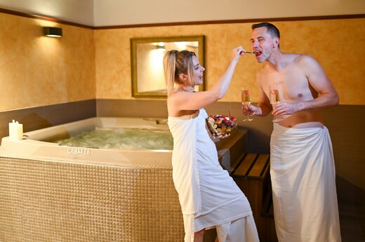 Užijte si jeden druhého v absolutním soukromí luxusního zážitkového wellness, které je připraveno pro vaše společné harmonické chvíle. Čeká vás zde koupel v hydromasážní vaně pro dva a vodní lůžko s nebesy. Pro dokonalou pohodu a relaxaci bude připravena vychlazená lahev Prosecca a sladké ovoce.