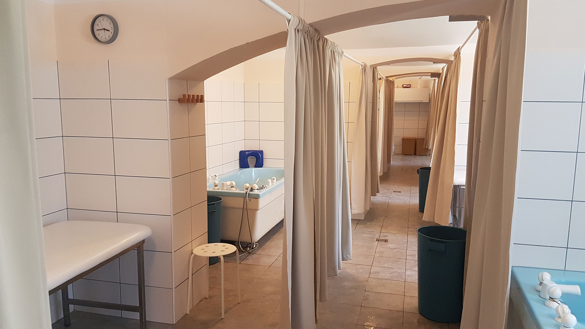 V podzemním podlaží budovy je umístěn provoz vodoléčby se 6 stanovišti přísadových a perličkových koupelí, jedním pracovištěm přísadových koupelí s aplikací cignolínu, pracoviště vlasového cignolínu, vířivé koupele dolních končetin, kontrastní koupele dolních končetin takzvané Kneippovy lázně. Součástí vodoléčby je také pracoviště fototerapie, které navazuje na balneoterapii. Je zde také pracoviště aplikace parafínu.